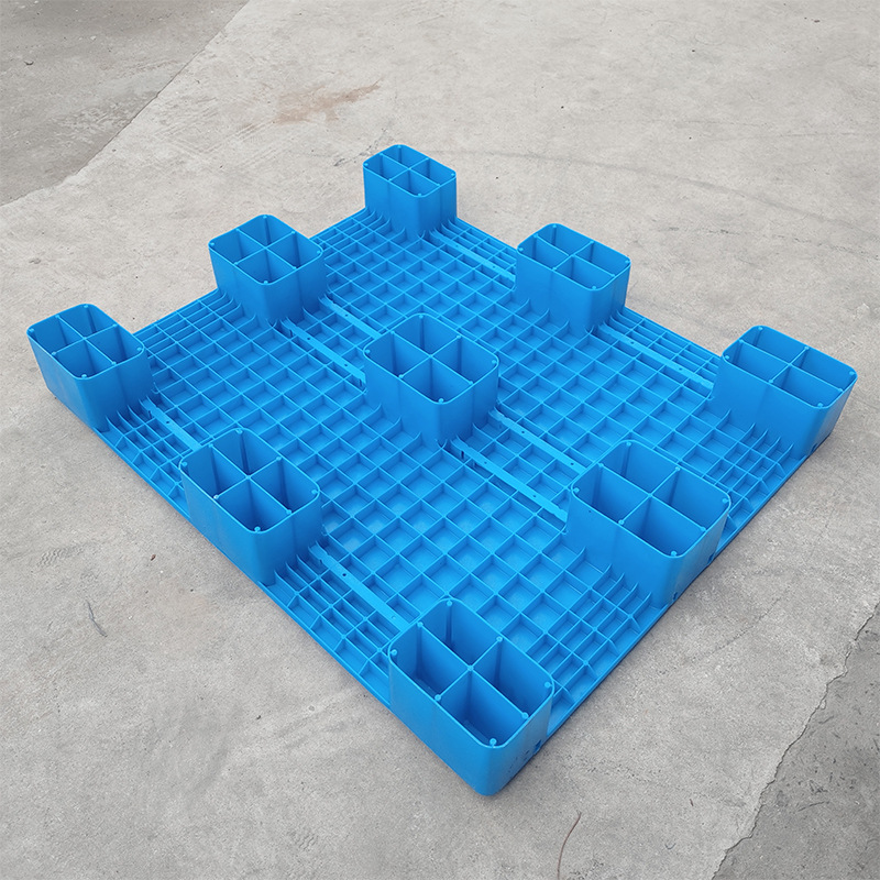 九脚网格塑料托盘的九脚网格托盘其底部是有‘九个腿’组成的,表面为‘网格’状,顾行业为方便称其为九脚网格托盘,九脚网格托盘大多型号的都为轻型的塑料托盘,不易用于上货架或者较重货物的周转使用,大多情况下九脚网格塑料托盘都是用来仓库货物垫仓板防潮使用,对于轻型货物的周转也可。